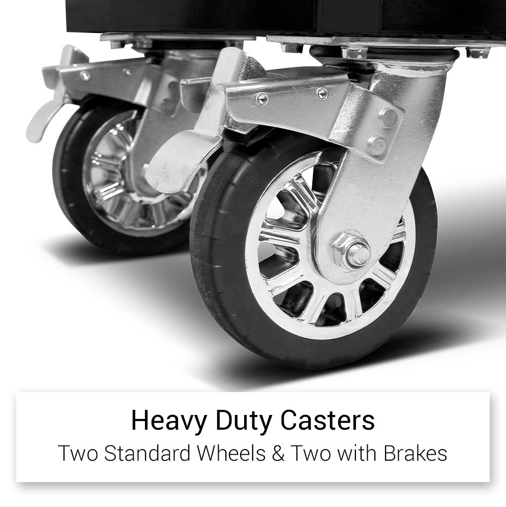 Four large castor wheels, two fixed and two swivel, that include brakes.